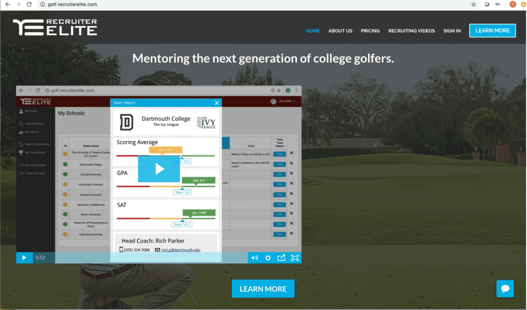 The Recruiter Elite online database features detailed information on nearly every NCAA and NAIA golf program in the country, and has the tools to guide players and parents through the entire recruiting process. The app includes approximately 100 videos, scripts and templates, as well as, a search and tracking tool to help you find a school that meets your academic and athletic needs.