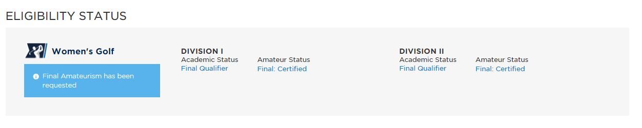 Next, you will complete a few modules on NCAA banned drugs and sports wagering and at the end, sign off to acknowledge that you have read and comply to the information provided. You will then request your Amateurism Certification. Here, the Eligibility Center will look through all of your information (transcripts, GPA, test scores, courses, etc.) to either approve or disapprove your certification for academics and amateur status. If you plan to participate in more than one sport, you will have multiple certifications. The certification will look similar to the one pictured below: