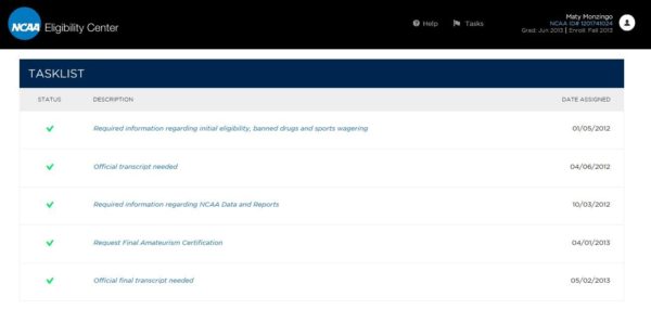 After completing this step you will receive an NCAA ID# which you should keep for reference. You’ll then send in your transcripts and test scores. While taking your ACT or SAT you also have the option to provide a code to your testing agency to send your scores directly to the NCAA Eligibility Center. And if all of this gets very confusing, don’t worry the Eligibility Center has created a task list for you to visit if you have not completed certain requirements (pictured below).