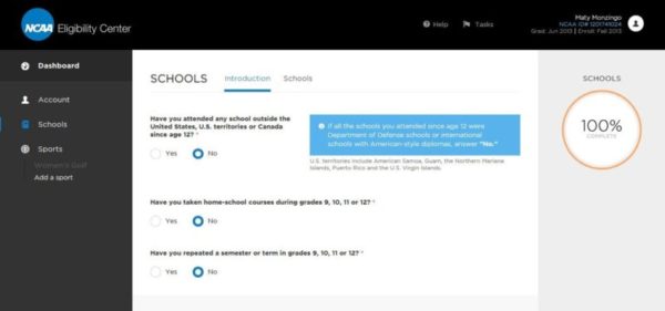 The process of creating an account with the NCAA Eligibility Center is fairly easy. First, you’ll start with the account creation. Here, you will input all of your personal information (name, address, email, phone number, high school, graduation year, etc.) They will also ask a few basic questions on your high school career and the sports you have competed in (pictured below).